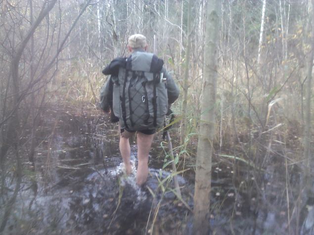 28/42 Saare järve äärest metsaradu pidi üle Uhmardu jõe Papijärve äärde uue nimega Paljassääre saarele. Oktoobrivihmadest kõrge veeseis.